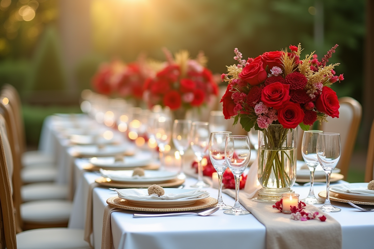 - Maîtriser la présence du rouge : sur la table ou dans la décoration, privilégiez les détails subtils : serviettes, menus, rubans autour des bouquets, photophores colorés. Pour la déco florale, associez pivoines rouges, roses anciennes ou dahlias à des feuillages aériens et des fleurs blanches. L’équilibre visuel se joue dans la nuance.
